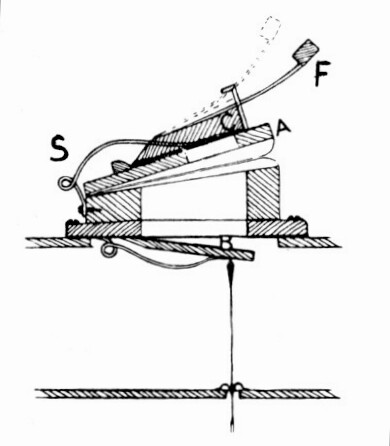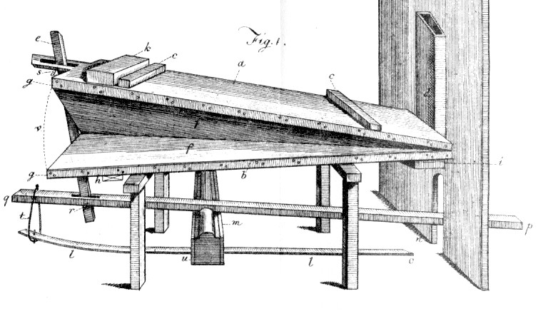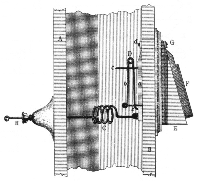 Spanbalg mit Treteinrichtung und Blattfeder-Belastung. Quelle: Georg Ch. F. Schlimbach, Ueber die Structur, Erhaltung, Stimmung und Prüfung der Orgel. Leipzig 1801, Tafel I.