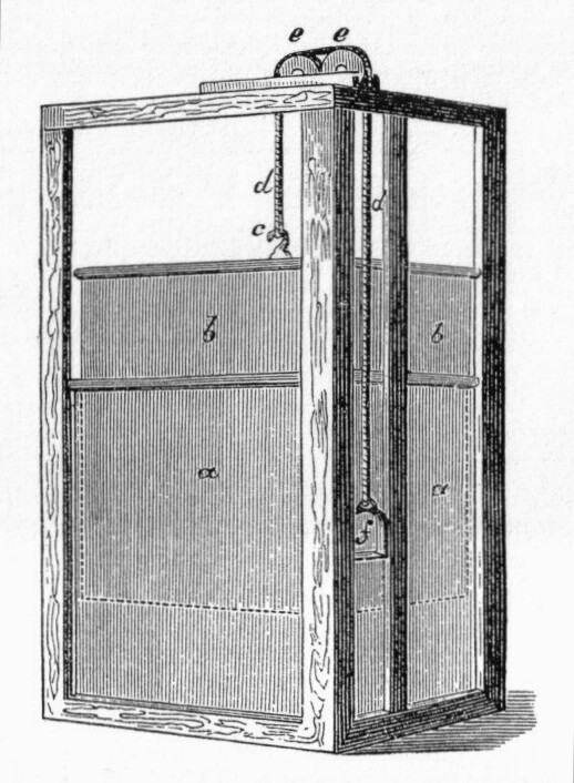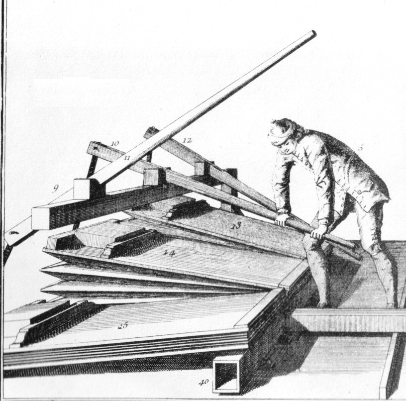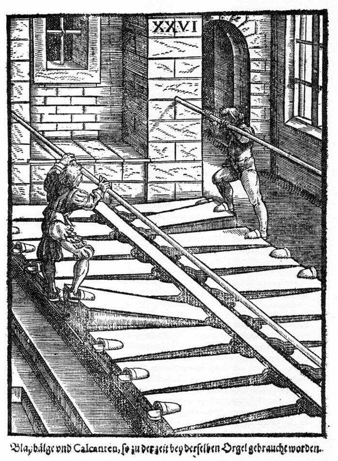 Natürlich hängt in diesem Fall der Winddruck, den ein Balg produziert, vom Gewicht des Mannes ab, der ihn tritt. Das führt zu Problemen, wenn die Kalkanten sehr unterschiedlichen Gewichts sind. Folglich wurden später die Bälge mit Gewichten belastet und mittels eines Holzbalkens unter Ausnutzung der Hebelwirkung aufgezogen, wie die folgende Darstellung von Dom François Bédos de Celles 1766 zeigt: