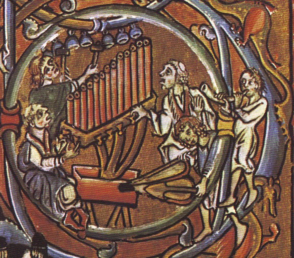 Diese Darstellung einer Doppel-Wasserorgel stammt aus dem Utrechter Psalter, der in der Gegend von Reims im 9. Jahrhundert unter byzantinischem Einfluß entstanden ist. Jeder Teilorgel sind zwei Kolbenpumpen zugeordnet, der Wasserbehälter ist eine Art runde Tonne, aus dem der obere Teil der Glocke herausragt.