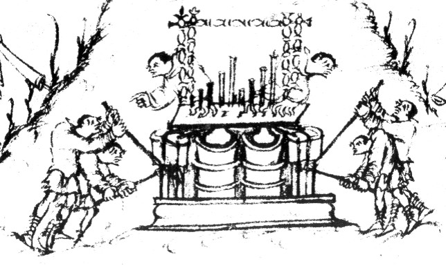 Mittelalterliche Tonschleifenorgel mit Schmiedebalg. Quelle: Codex München, Universitätsbibliothek, 4° Cod.ms.24, fol. 2r
