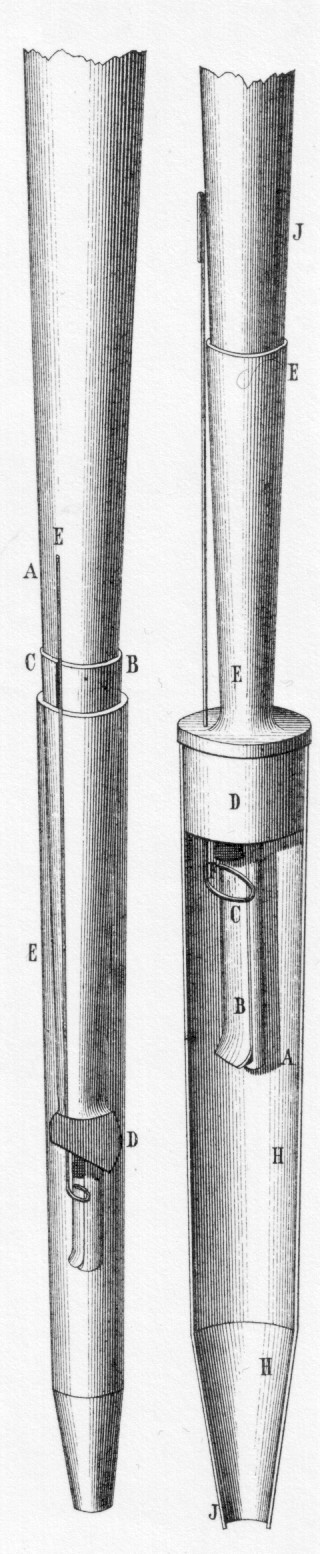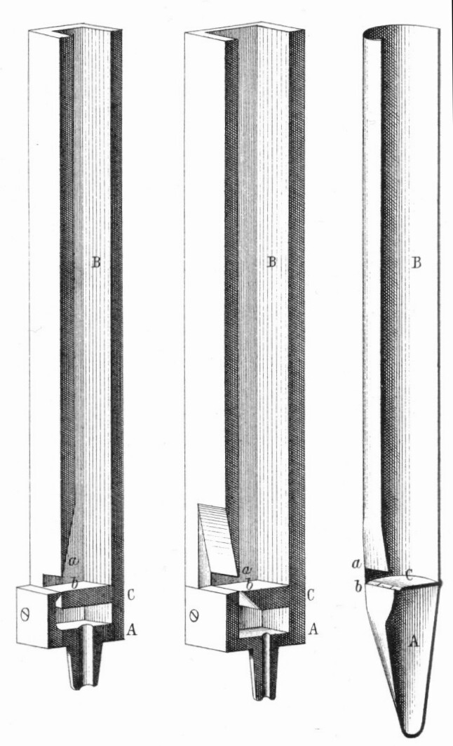 Bild rechts: Zwei Zungenpfeifen unterschiedlicher Konstruktion mit aufgeschnittenen Stiefeln. Quelle: Johann Gottlob Töpfer, Die Theorie und Praxis des Orgelbaus. Hg. v. Max Allihn, Weimar 1888, Tafel XI